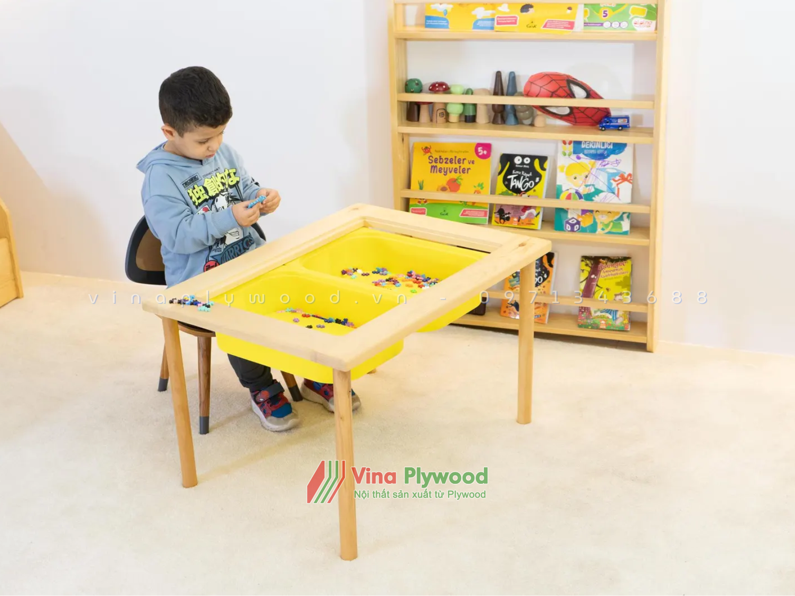 Hộp chứa tháo rời: Bàn tích hợp khay chứa lớn (thường làm bằng nhựa an toàn) để đựng cát, nước, hoặc các vật liệu chơi giác quan khác.