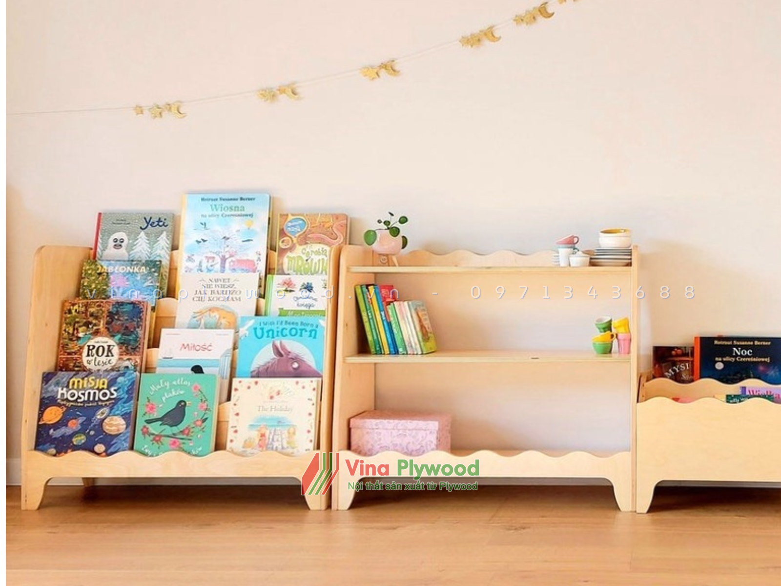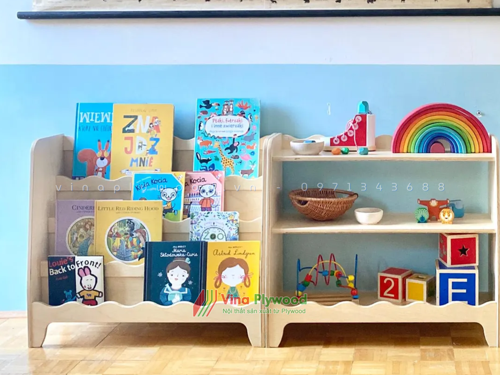 Giá sách Montessori được sử dụng chất liệu gỗ Plywood Phủ Melamin tuyệt đói an toàn cho bé